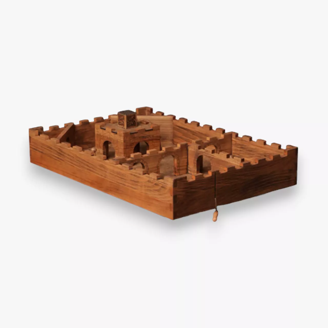 This is a solo-play game where the player launches a spinning top using a handle and string. Once released, the top moves through different rooms, aiming to knock down pins along the way.
